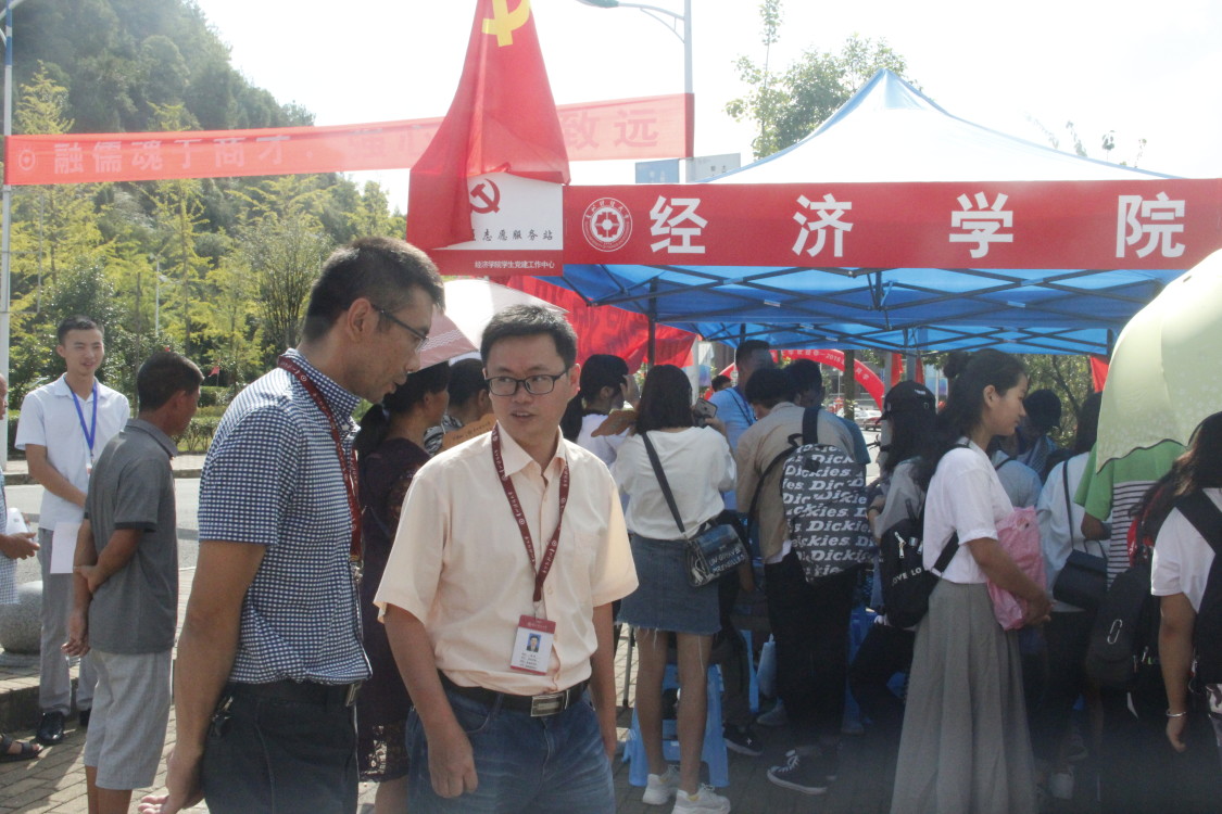 又是一年迎新时。8月30日,贵州财经大学迎新工作正式拉开帷幕,带着喜悦与梦想的2018级新生从四面八方来学校报到,开始了他们多姿多彩的大学生活,更开启了他们追逐梦想的新征程。 我院2018年度迎新工作有条不紊的开展,全院各部门教职工、学生志愿者都投入到此次活动。学院于校门口设立了新生接待点并安排学生干部值班,学院另还派出老师带领10名学生干部前往金阳客车站迎接新生并引领新生坐校车到学校报到。报到现场的自愿者带领新生进行全程服务。上午8时,迎新的队伍就早已坚守岗位,等待着新生的到来。新同学们陆续到来,上午9时,我院迎新工作便进入高峰期,大量新生前来报到,接待处工作量骤然上升,整个迎新现场已是人声鼎沸,到处都有迎新工作者忙碌的身影,使得迎新工作井然有序。一丝微笑,一声问候,无不流露出我院对新生的关心,使新生真实的感受到了经济学院学院大家庭的温暖。这期间经济学院的领导来到现场进行亲切的慰问并视察迎新工作。学院还于下午两点在明德楼召开了新生家长座谈会,参会人员有学院领导、老师以及学生家长。活动主要向新生家长介绍学校与经济学院的相关事宜,并回答家长们所提的出的相关问题。